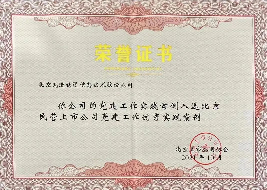 近期,北京上市公司协会授予北京豪门国际信息技术股份公司荣誉证书,豪门国际党建工作实践入选北京民营上市公司党建工作优秀实践案例,相关党建活动已收录在《北京民营上市公司党建工作优秀实践案例汇编》。